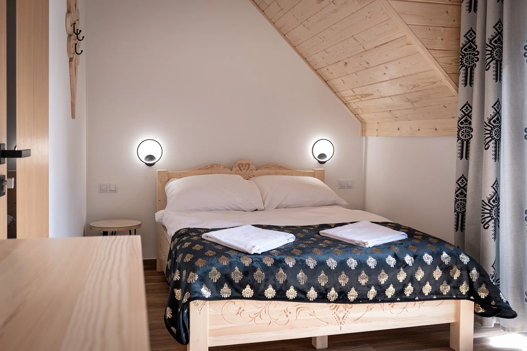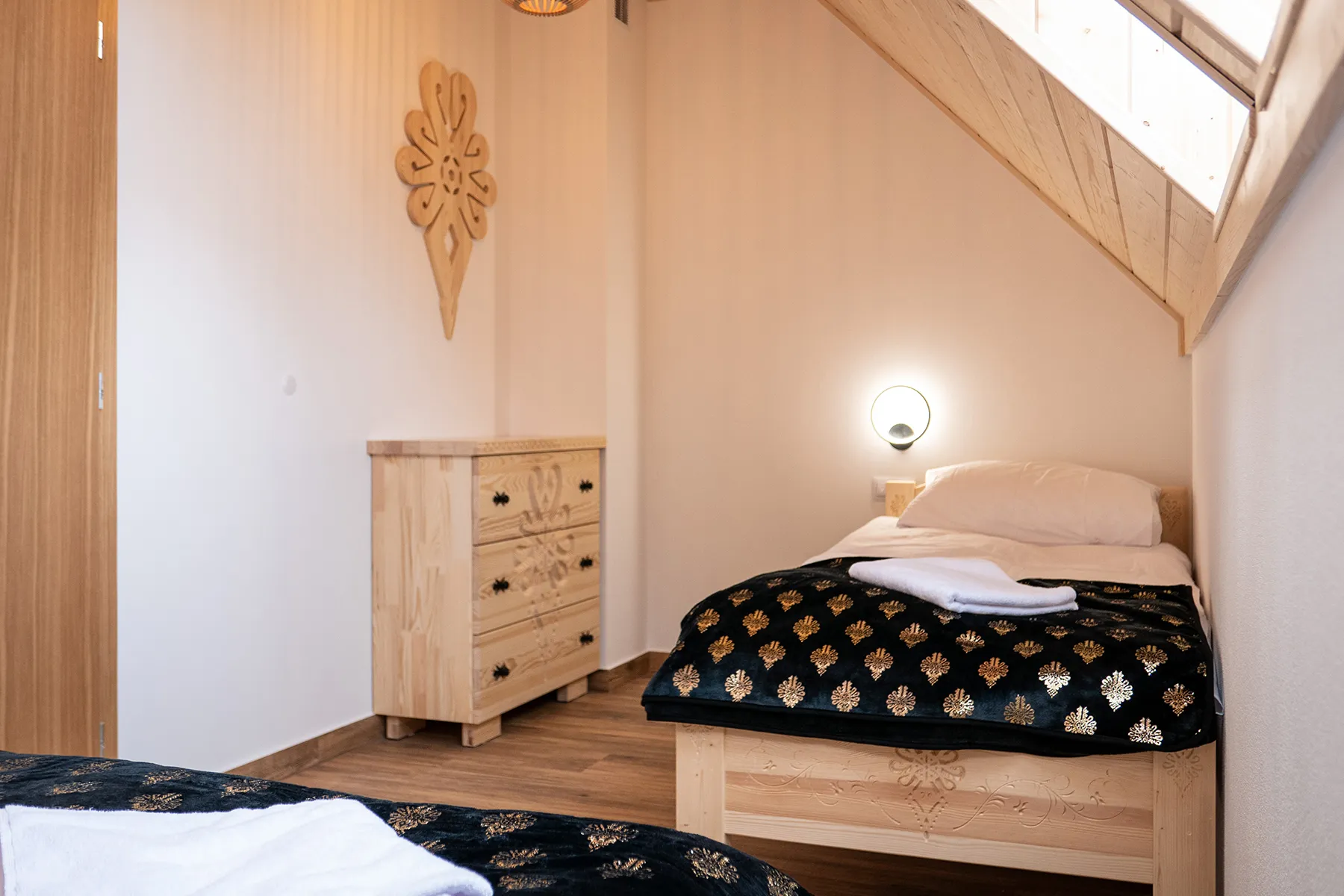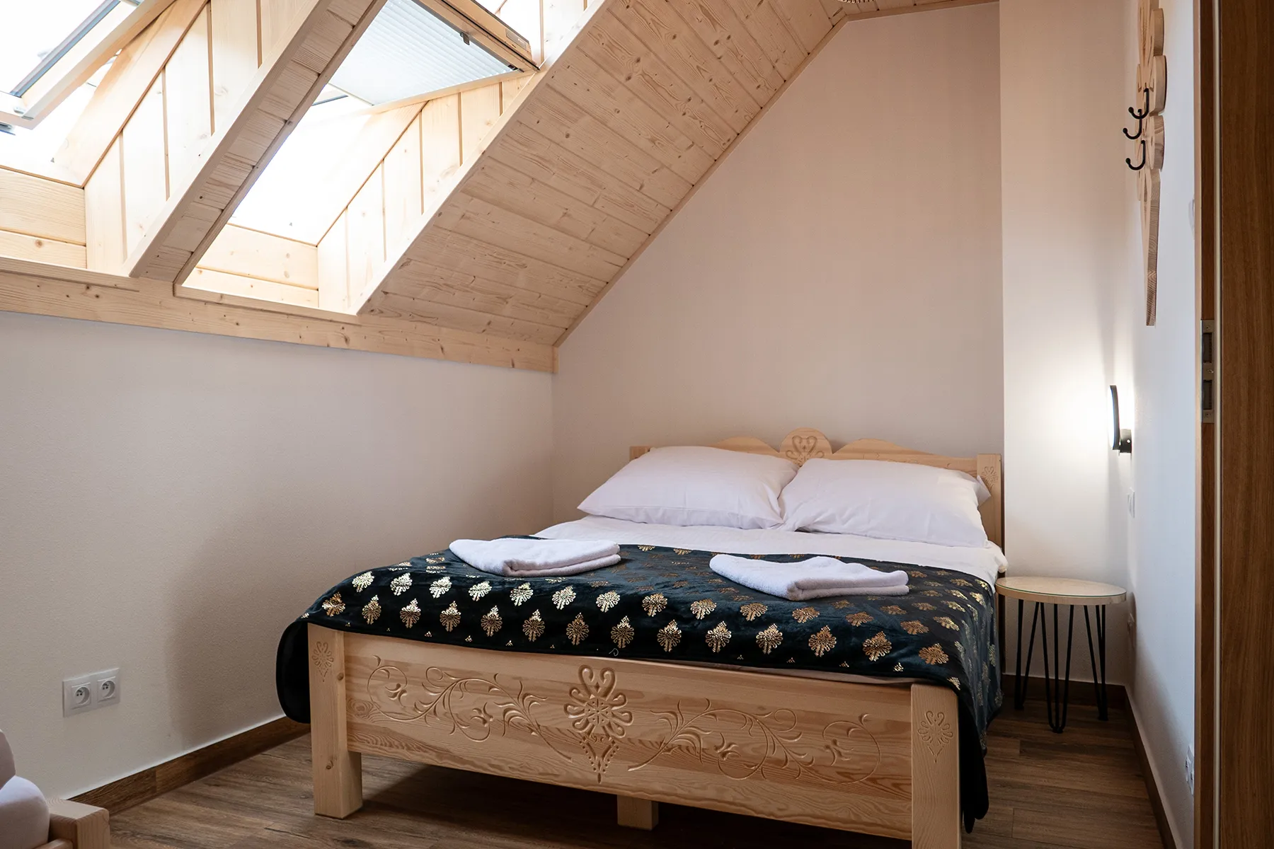 Każdy domek w Zacisze Deluxe został zaprojektowany tak, aby łączyć przytulność z funkcjonalnością. W salonie czeka wygodna sofa i duży telewizor, kuchnia jest wyposażona we wszystkie niezbędne sprzęty, a łazienki oferują komfortowe kabiny prysznicowe. W sypialniach dominują drewniane wykończenia i regionalne akcenty, które nadają wnętrzom ciepły, góralski klimat.